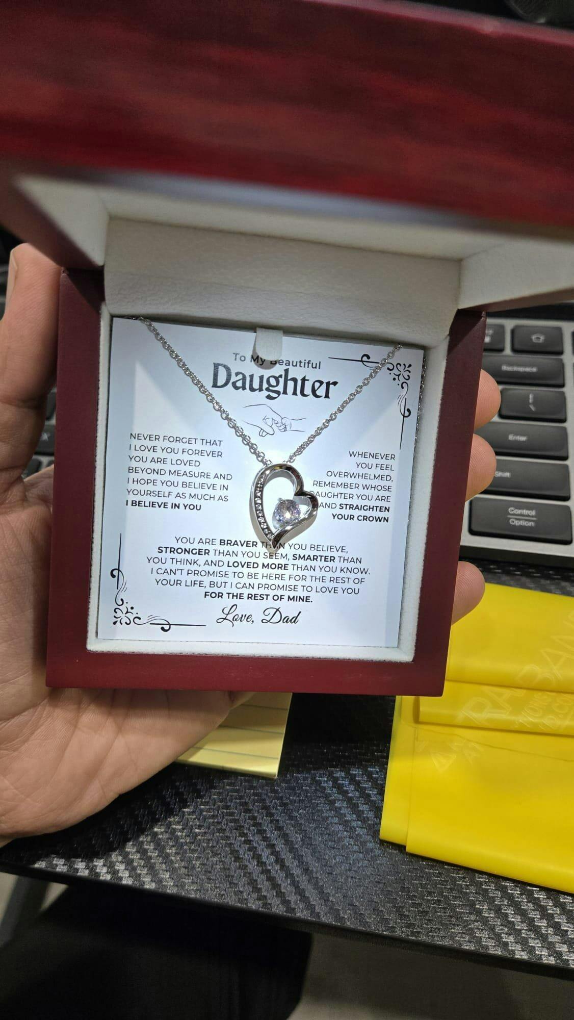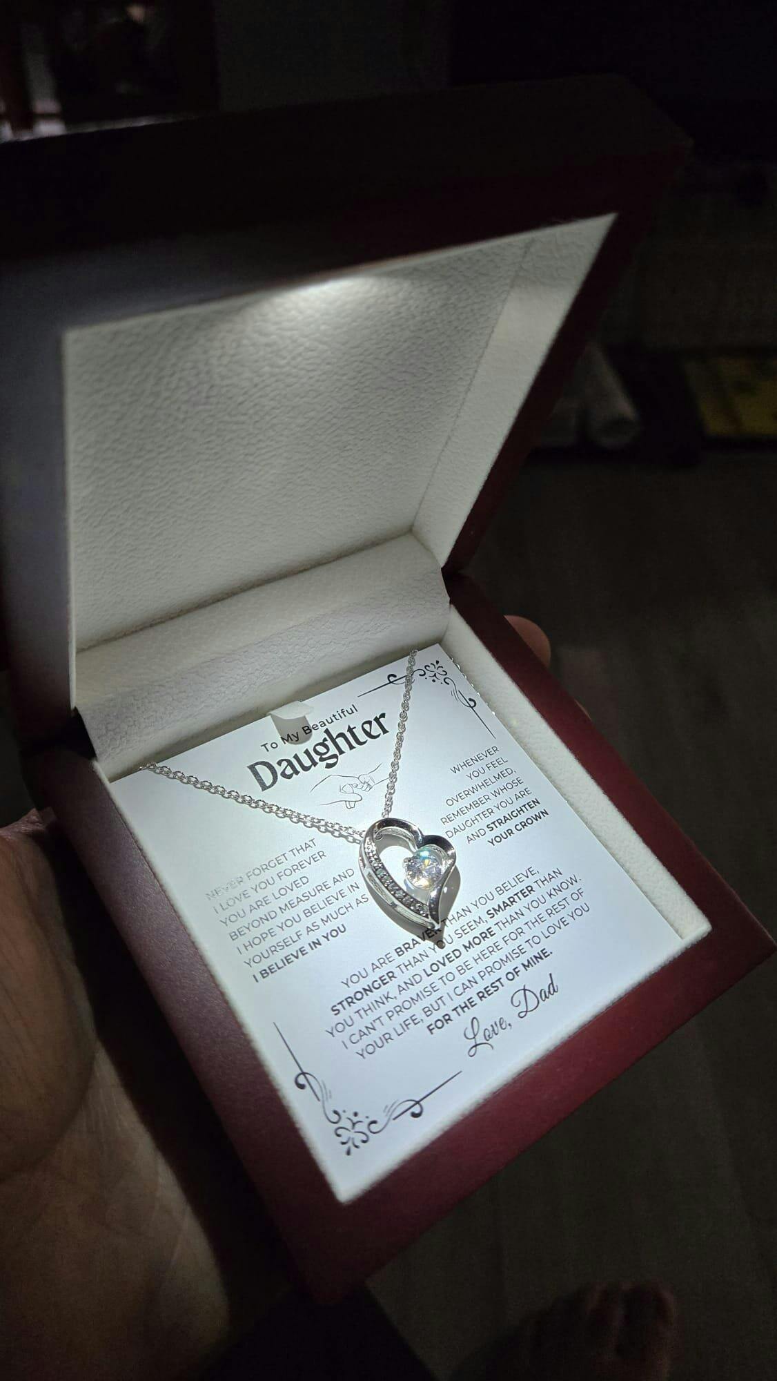 She read message on the card and cried like never before. this was the greatest moment i had with my daughter. no she wear it all the time. thank you.